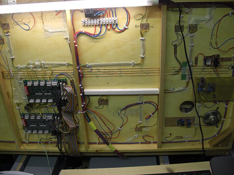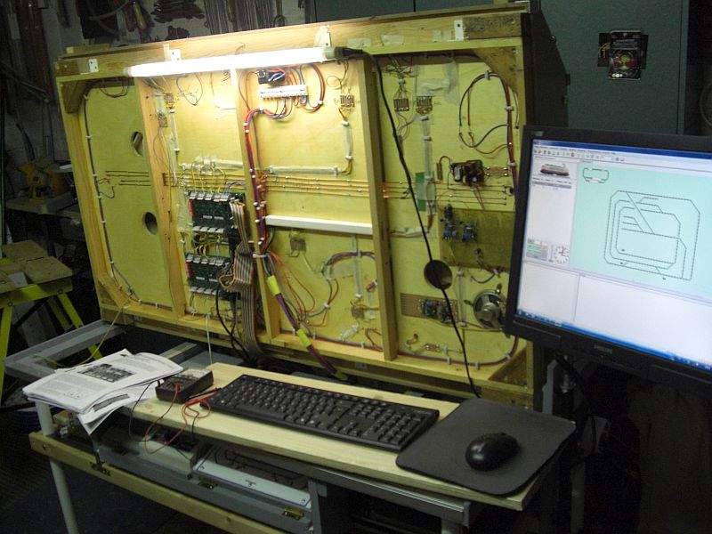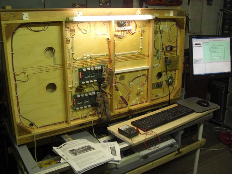 Rechts der Monitor mit dem Gleisbild zum Steuern der Bahn