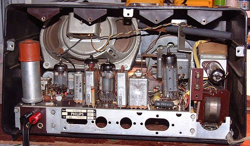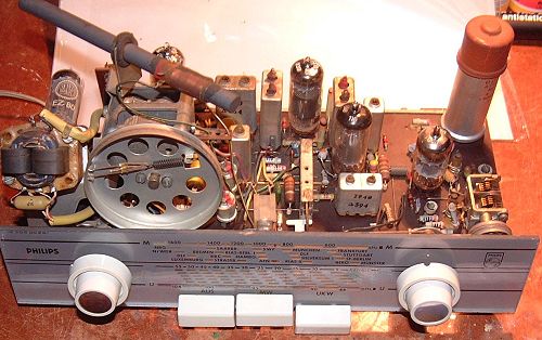 Das Gerät bei abgenommender Rückwand, es war wohl eine Sparversion weil kein Phonoeingang vorhanden ist und nur 2 Wellenbereiche. |